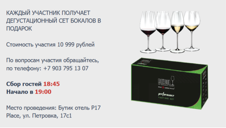 Компания NOVABEV GROUP - эксклюзивный импортер RIEDEL в Россию, представляет бокальную дегустацию «Бокалы и Вино» - событие, которое проведет Вице-президент по продажам Riedel в России и СНГ Александр Зорин.